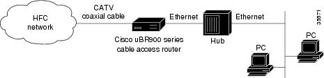 The Cisco uBR925 cable access router can connect to a PC through either its Ethernet hub ports or through its Universal Serial Bus (USB) port. If supported by the service provider, the router can connect more than one PC using both types of connections.